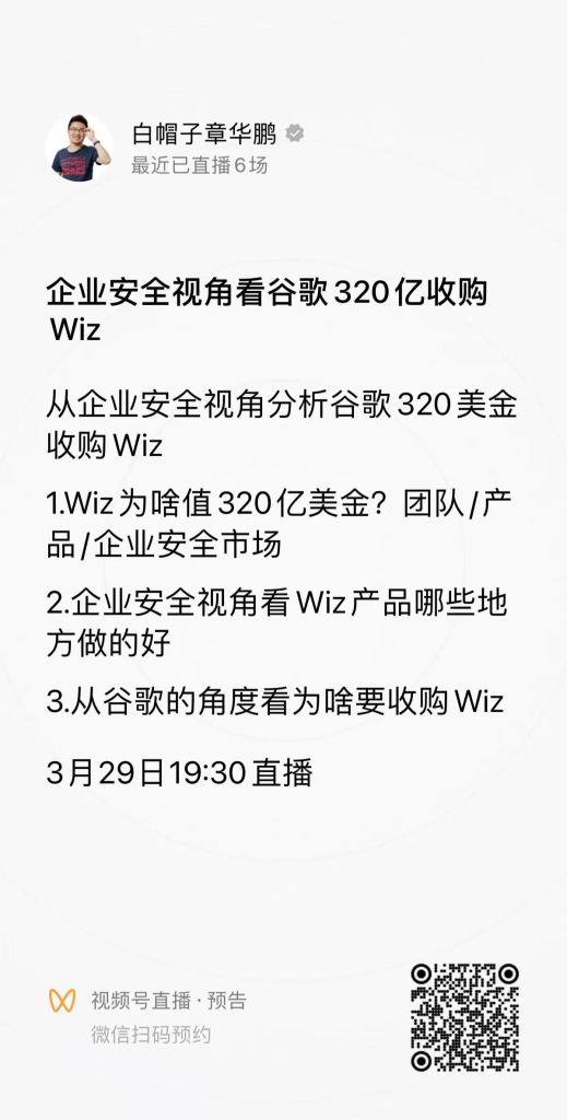 那么本周六晚19:30,我会尝试以我在企业安全建设和创业者的经验和视角来帮大家一起解读和分析一下Wiz这家公司。