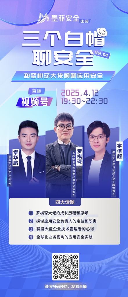 4月12日晚19:30,我邀请了某跨境电商独角兽应用安全负责人罗棋琛大佬来一场直播深度的探讨做好应用安全工作的一些关键问题及最佳实践。